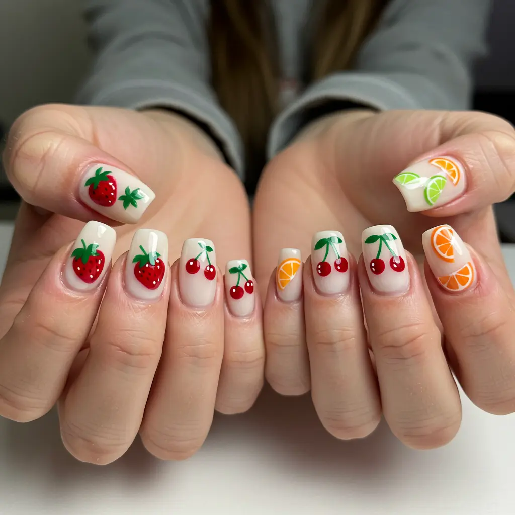Go for a fresh and vibrant vibe with matching fruit-themed nails like strawberries, cherries, or citrus slices.