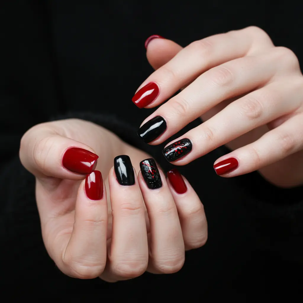 One of you can wear deep red nails with black accents, while the other rocks black nails with red details for a dark and dramatic look.