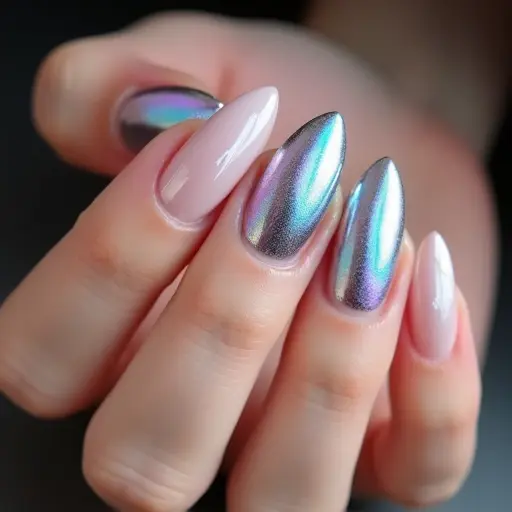 Both of you can go for a holographic chrome finish in different shades for a futuristic and eye-catching effect.