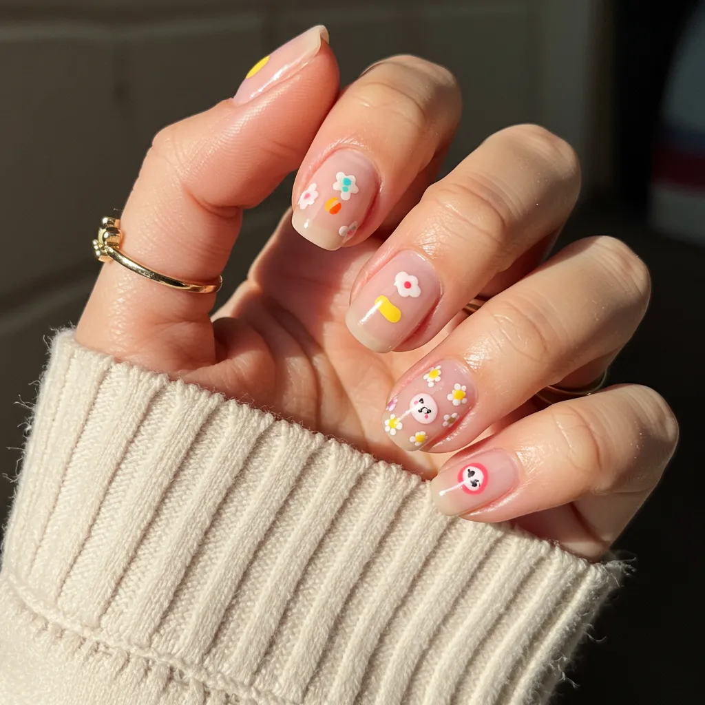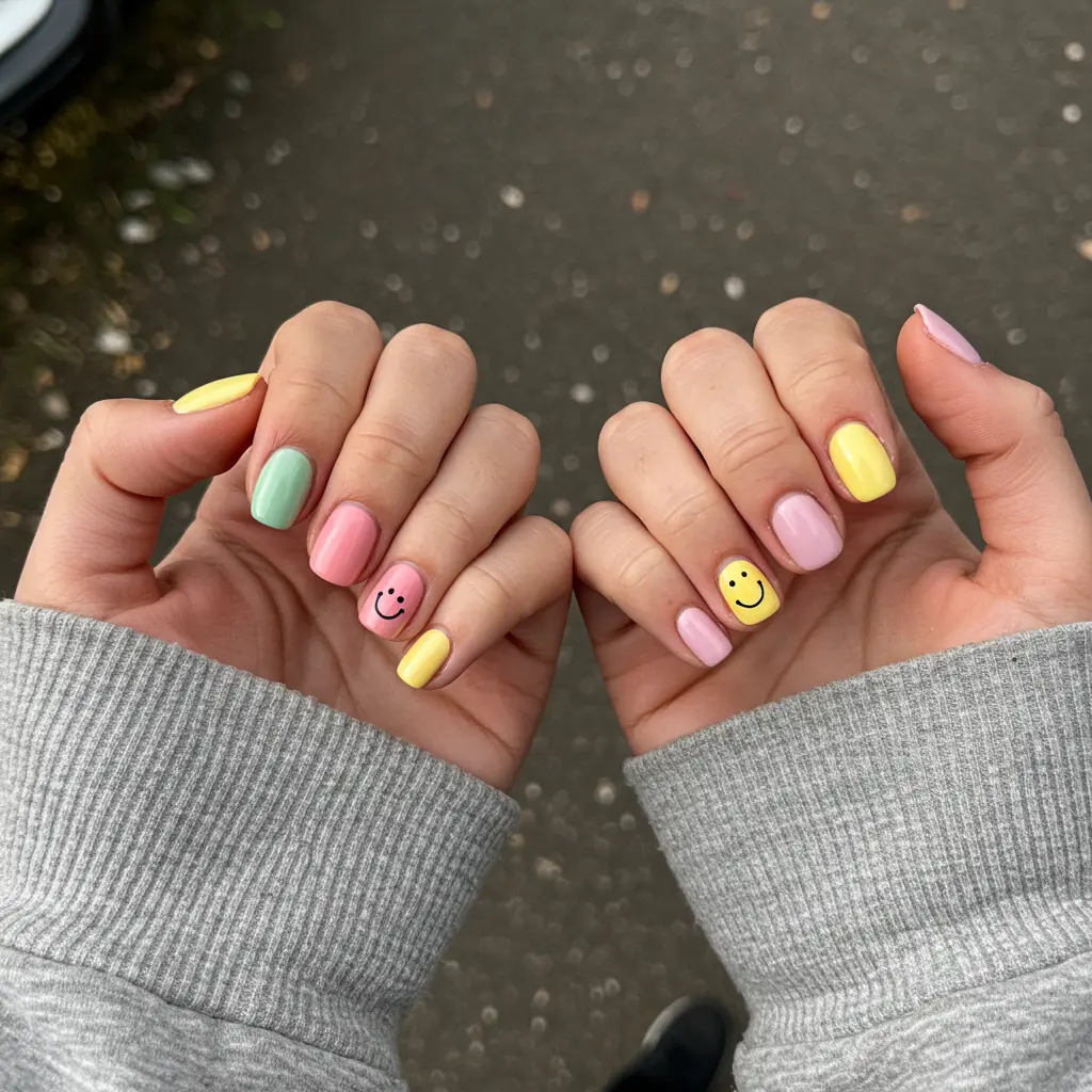 Choose a pastel or bright base color and add tiny smiley faces for a cheerful and fun best friend look.