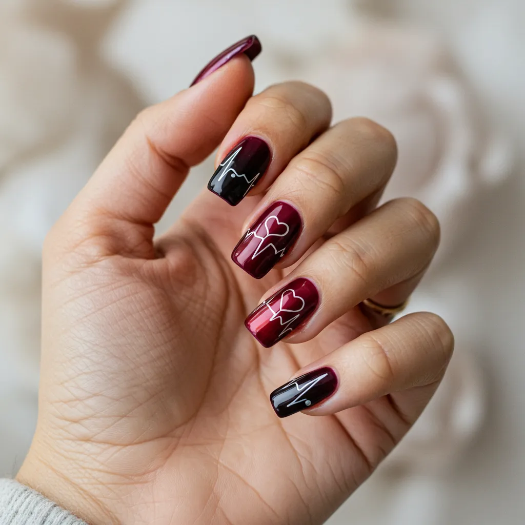 A continuous heartbeat or soundwave design across both sets of nails symbolizes your strong bond.