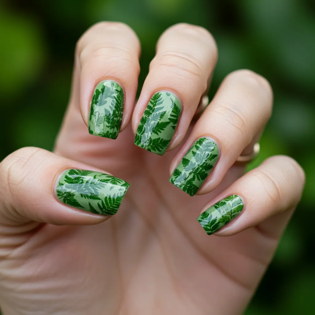 Earthy green shades and botanical prints give a natural, refreshing feel to your friendship nails.