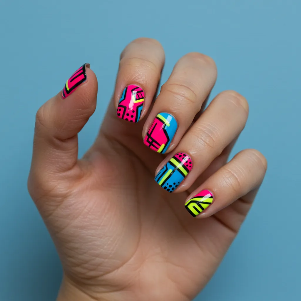 Try neon nails with bold black-outlined designs to make a statement together