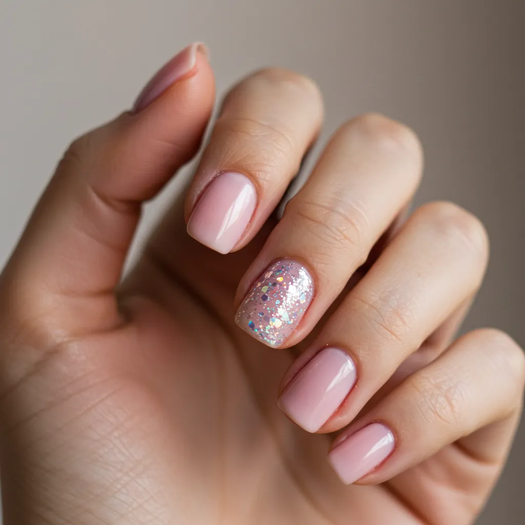 Add a touch of sparkle with one or two glitter-accented nails to complement a soft neutral base.
