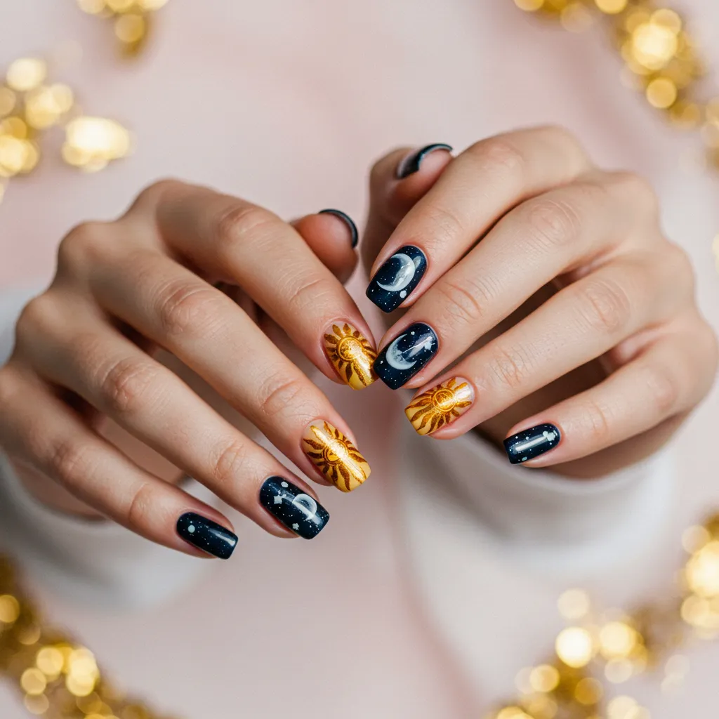 Represent balance with sun-themed nails for one friend and moon-inspired designs for the other