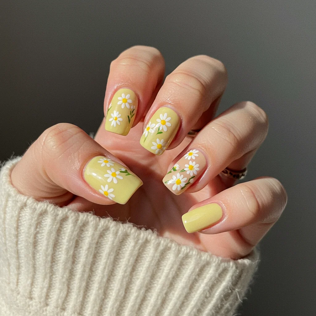 Cute white daisies on a nude or pastel base for a soft, floral touch.