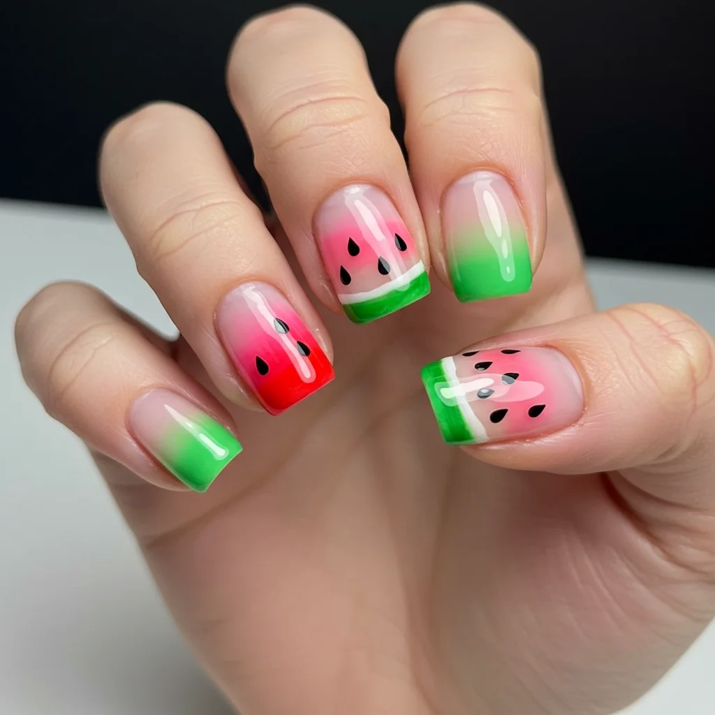 A playful mix of pink and green with tiny black seeds creates a fruity, refreshing design.