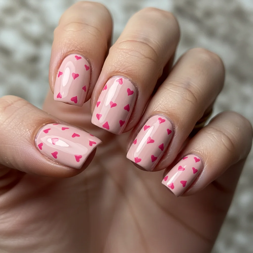 Delicate heart accents over a pink base create a sweet and romantic aesthetic.