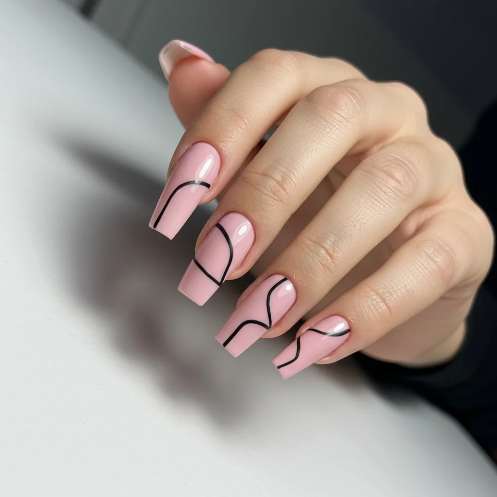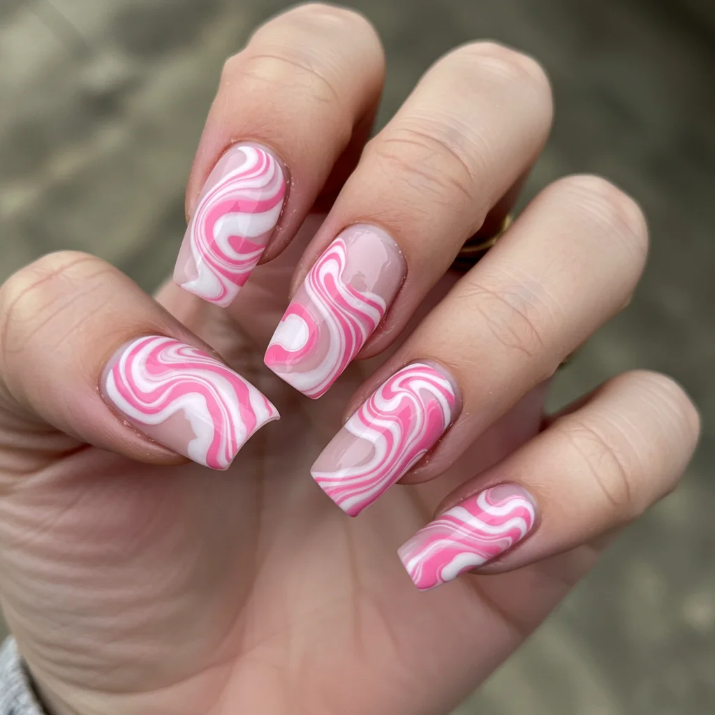 Swirly patterns in pink and white add a fun, modern twist to your manicure.