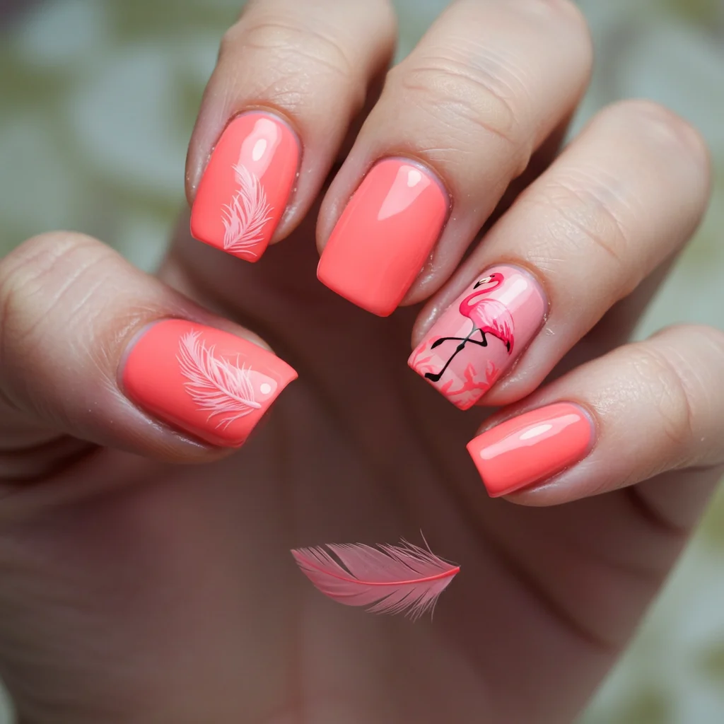 Cute flamingo designs over a pink base make for the ultimate tropical manicure.