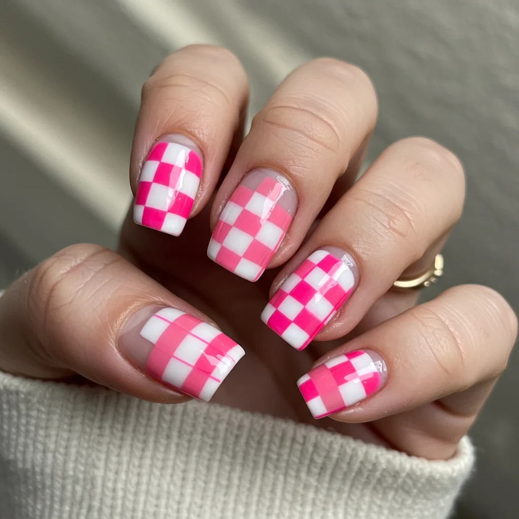 A trendy checkered pattern in pink and white gives a modern, playful vibe.