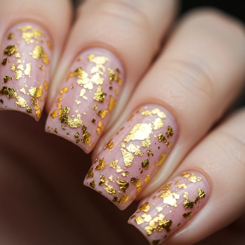 A touch of gold foil over a sheer pink base makes for an elegant, luxurious mani.