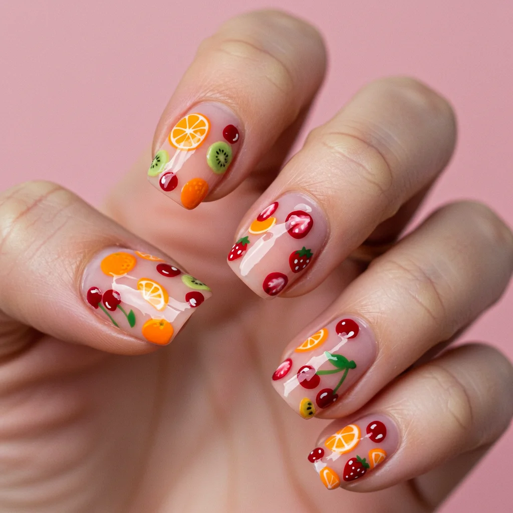 Tiny oranges, strawberries, and cherries for a fresh, playful look.