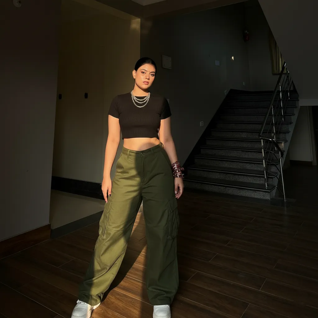 - Texture Play: Mix the sturdy cotton twill of the cargos with a soft, ribbed knit crop top or a sleek, stretchy bodysuit. For a dressier take, try satin cargo pants with a simple cotton tank.
