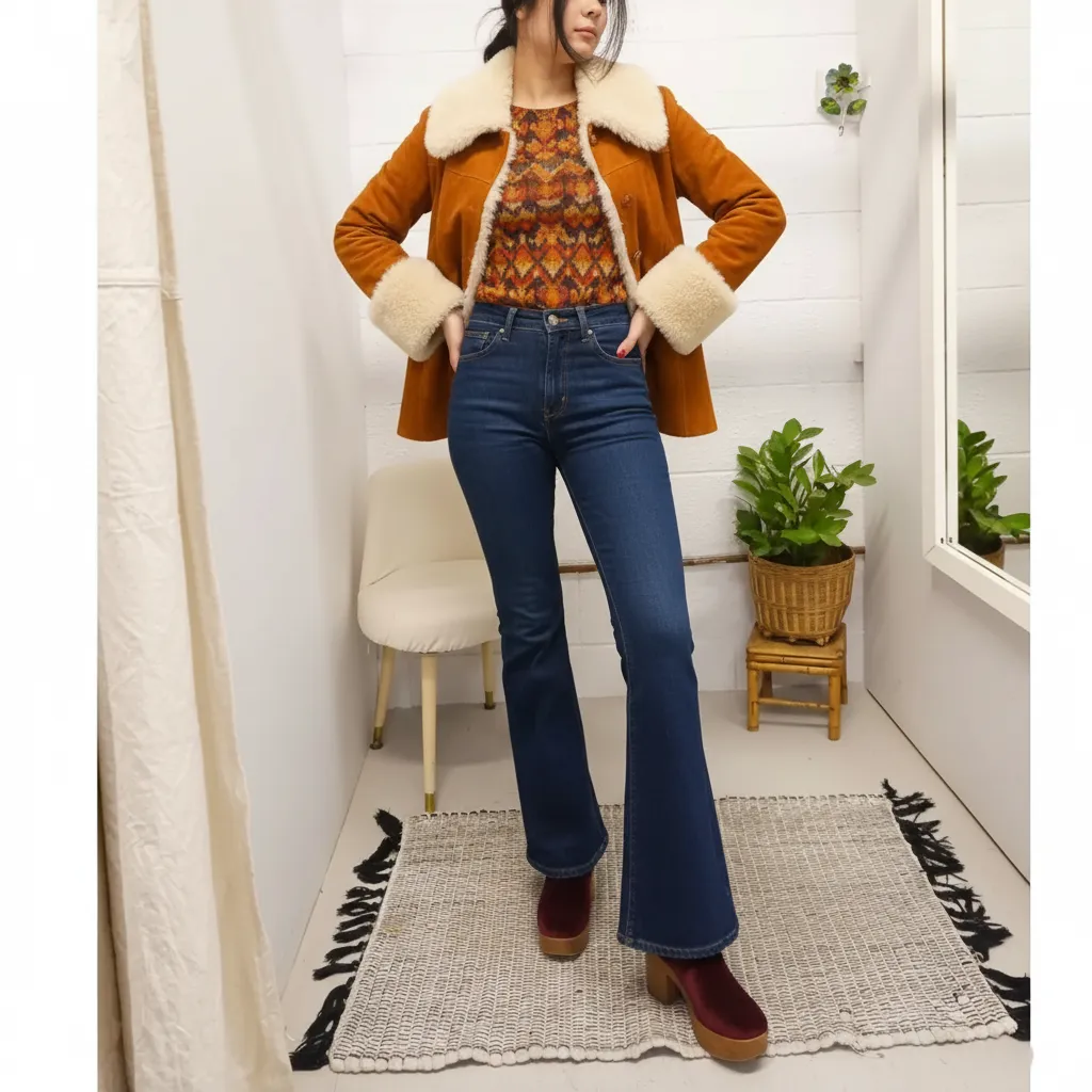 - Key Pieces: A shaggy, penny-lane style faux fur coat (often with a large collar), high-waisted flare jeans, a fitted turtleneck, and platform boots.