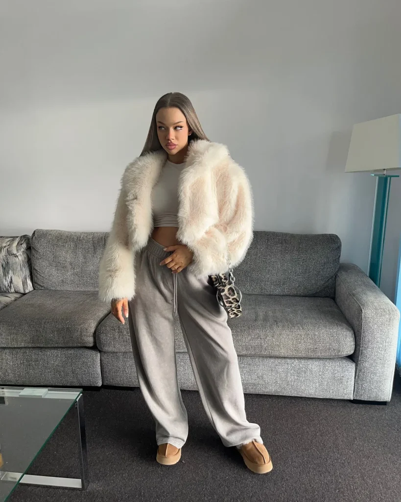 - Texture Play: The soft, brushed fleece or cotton of the sweatsuit provides a cozy, matte base that makes the plushness of the faux fur coat pop even more.