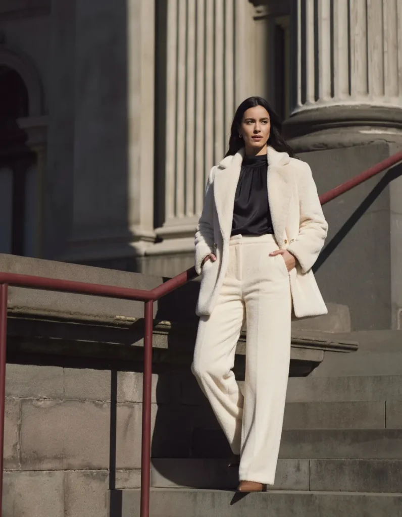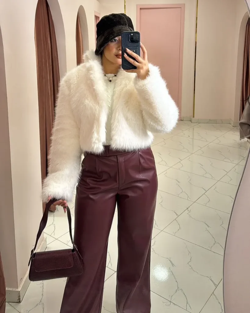 - Texture Play: The short, fluffy texture of the jacket contrasts beautifully with the smooth drape of crepe or wool wide-leg trousers.