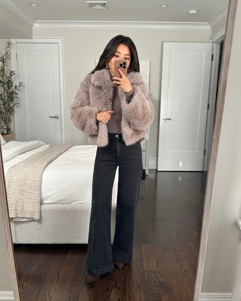 - Silhouette Secrets: A slightly cropped or hip-length faux fur coat works beautifully with high-waisted straight-leg or wide-leg jeans, creating a modern and balanced proportion.