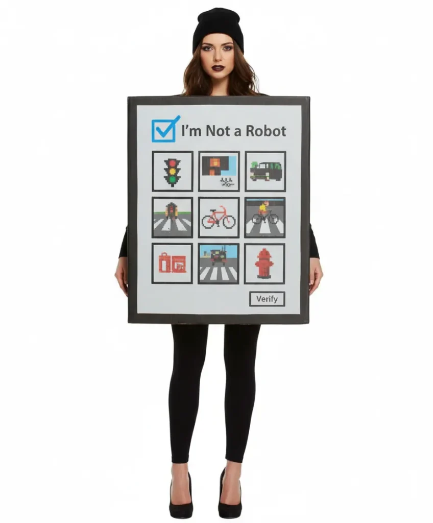 - What You’ll Need: A white t-shirt or a sandwich board made of poster board. Print out a 3×3 or 4×4 grid of slightly-too-zoomed-in images (crosswalks, bicycles, buses). Below the grid, add a checkbox with the words “I’m not a robot.”