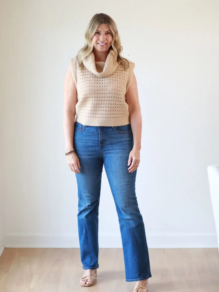 - Styling Tip: Do a quick “French tuck” (tucking just the very front of the sweater into your jeans) to define your waist and keep the oversized knit from overwhelming your frame.