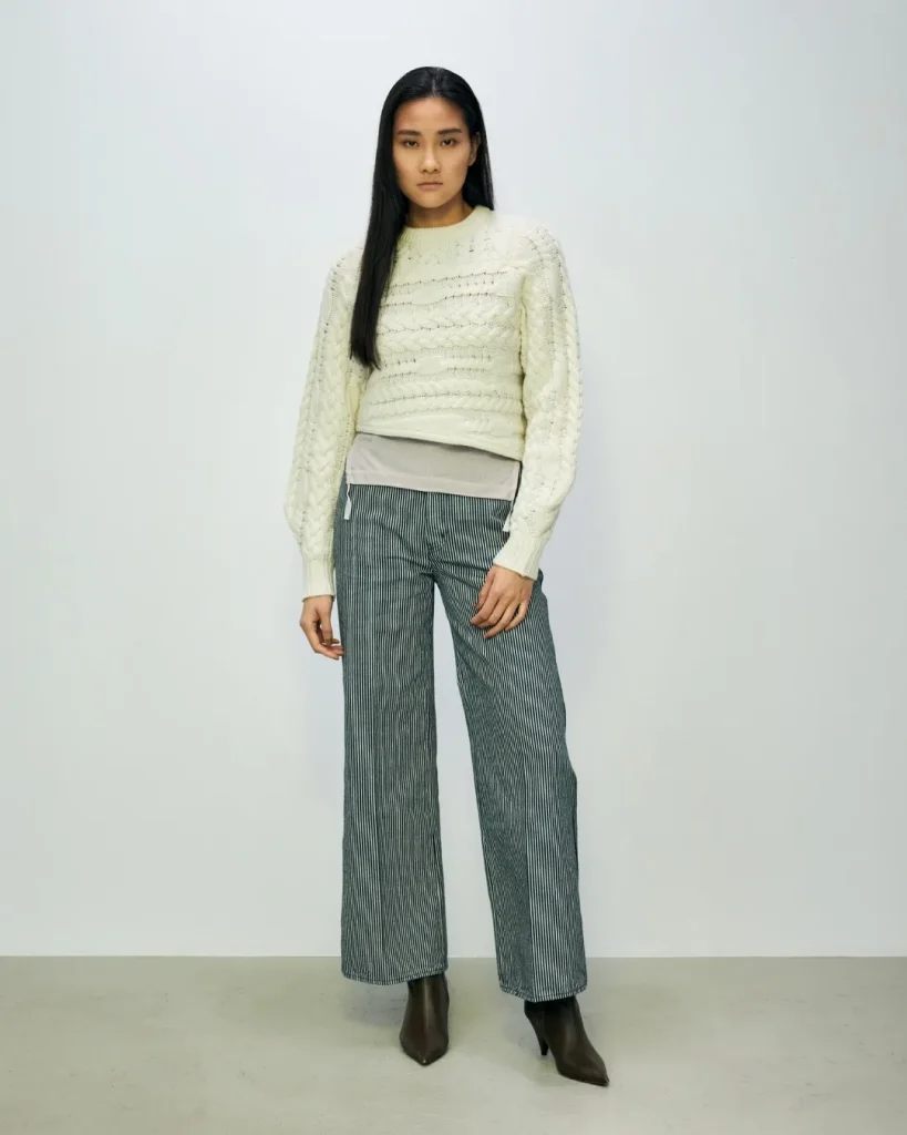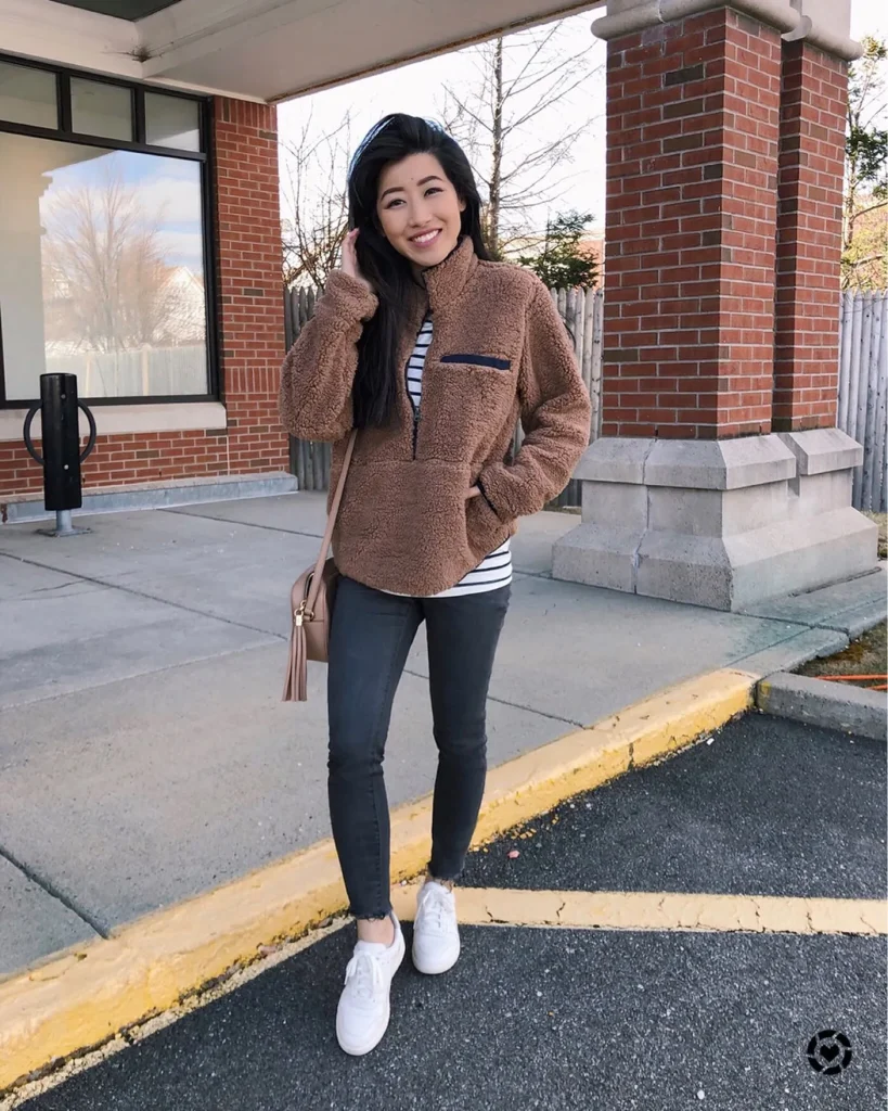 • Styling Tip: Do a “French tuck” of your sweater into high-waisted jeans and add a leather belt to create a defined waist and a more put-together silhouette.