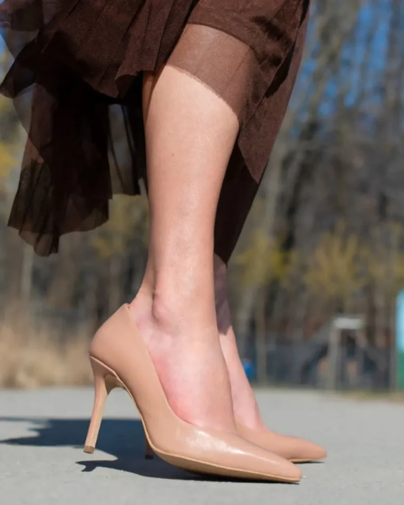 - Strategic Impact: Nude heels that closely match your skin tone create a seamless extension of your legs, blending effortlessly into your natural complexion. This unbroken line from your leg to your foot makes your legs appear longer and, consequently, you appear taller.