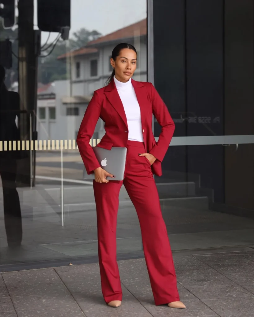 - Styling Tip: For a softer, more romantic feel, choose a suit in a dusty rose or soft blush color and pair it with a cream silk camisole.