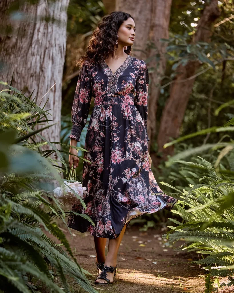 - Texture & Color: Look for flowy fabrics like chiffon, viscose, or georgette. The contrast between the dark, moody base color and the brighter floral elements is key.