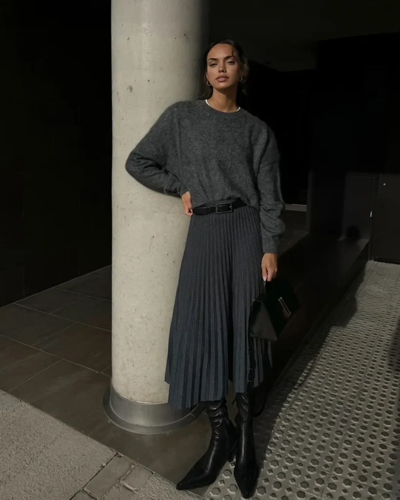 - Texture & Color: The magic is in the textural contrast: the shimmer and structure of the pleats against the soft, matte texture of a cashmere, merino, or cotton knit. Go for a rich color on the bottom and a neutral on top, or vice versa.