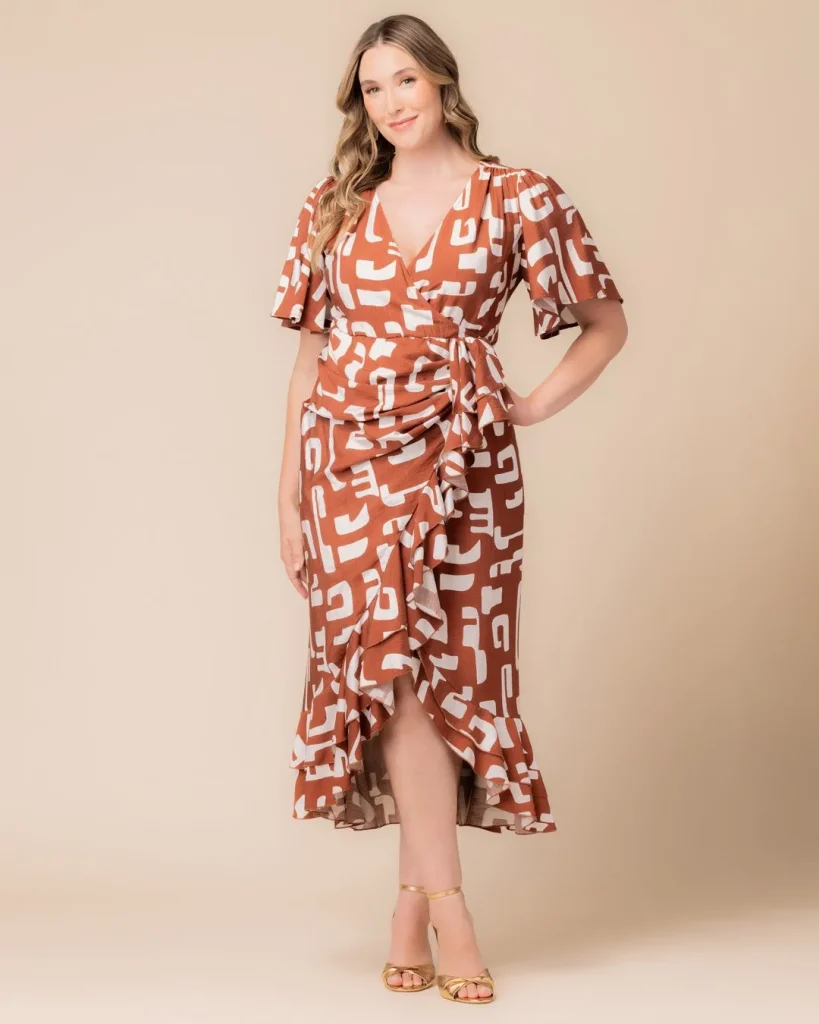 - Texture & Color: Look for prints that incorporate fall tones like mustard, olive, cream, and brown. A fluid jersey or viscose fabric will ensure the dress wraps and drapes beautifully.