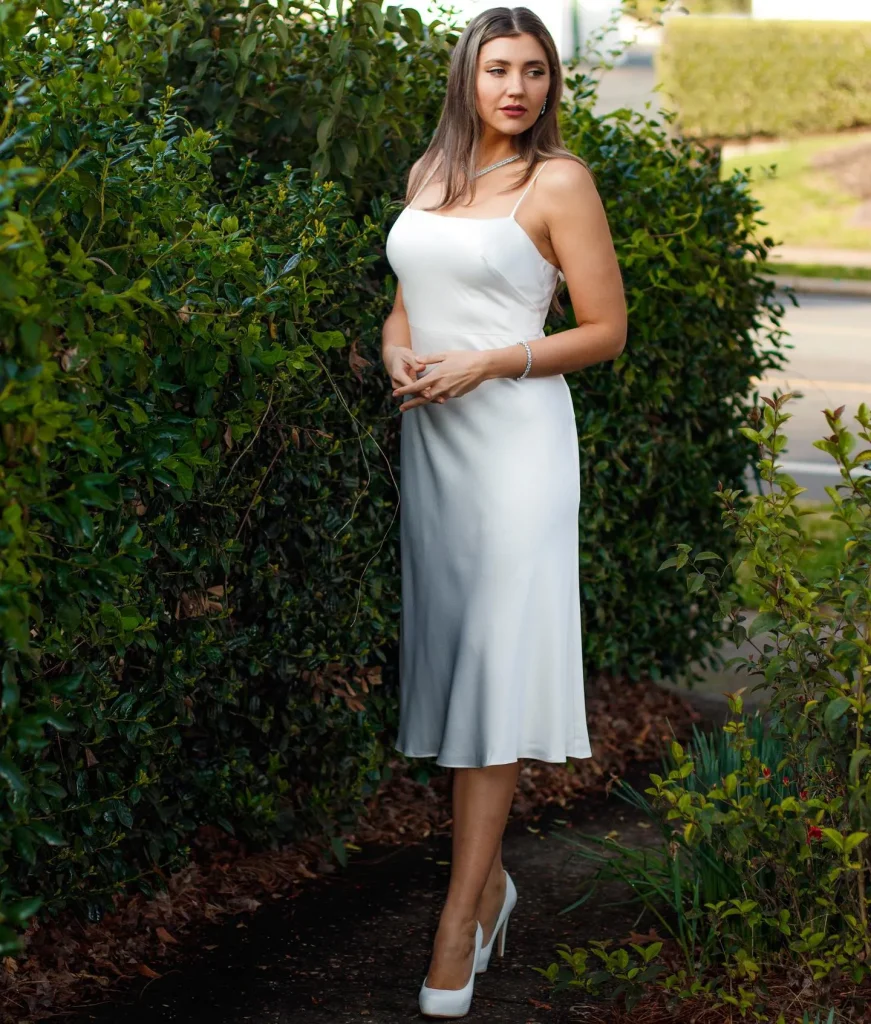 • Styling Tip: Layer a simple white crewneck tee under a silk slip dress and pair with clean white sneakers for a trendy, comfortable, and unexpected daytime outfit.