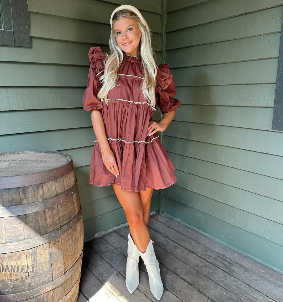 • Signature Item: A shorter dress with multiple horizontal fabric panels (tiers) that add volume and playful movement, ending above the knee.