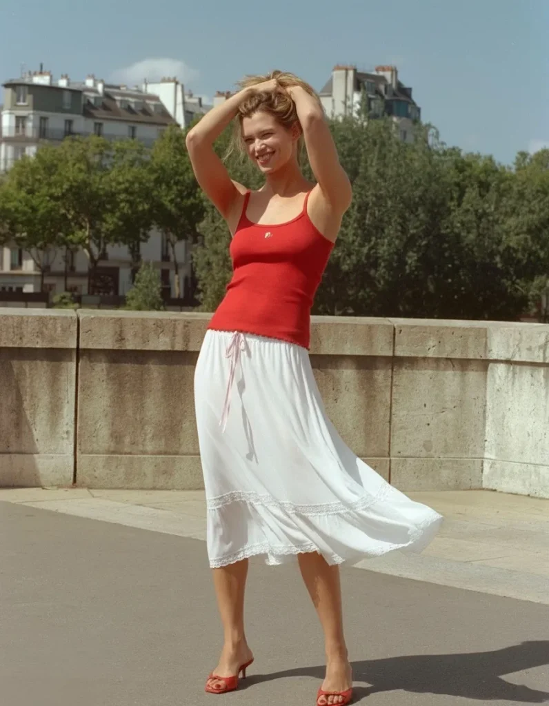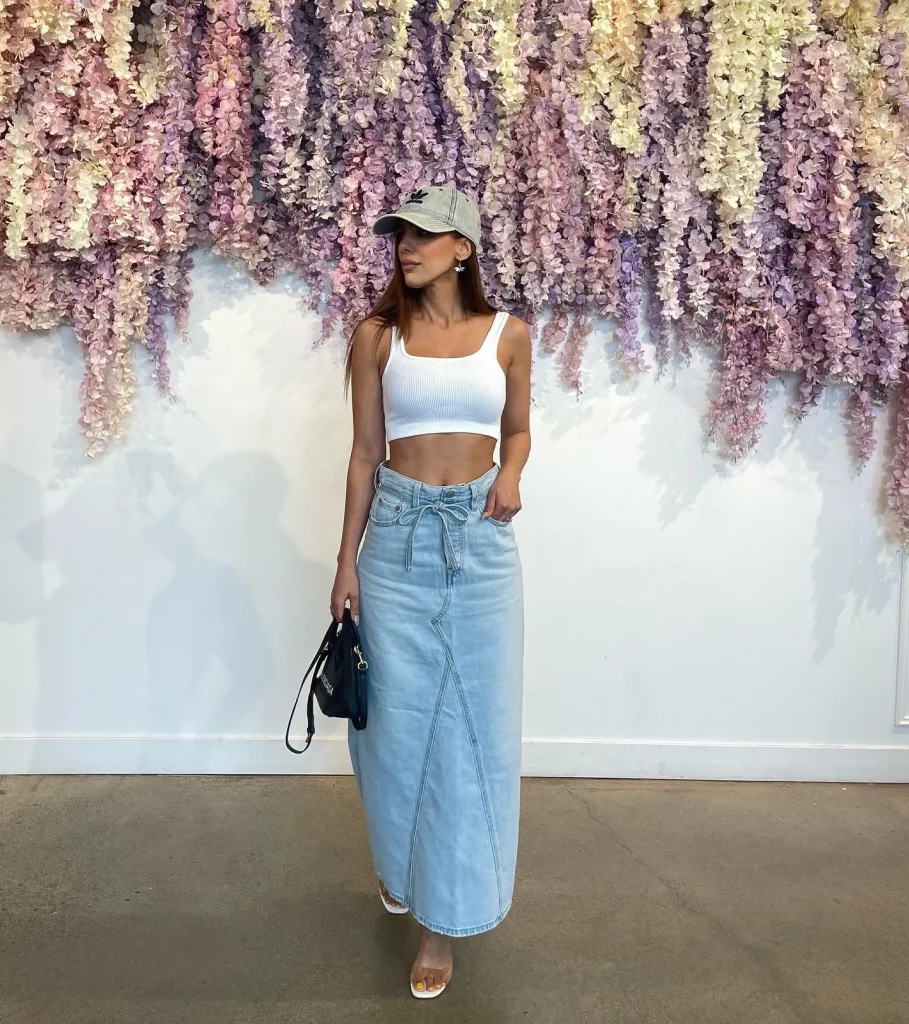 - Signature Item: A classic denim midi or mini skirt paired with a cropped ribbed tank top.