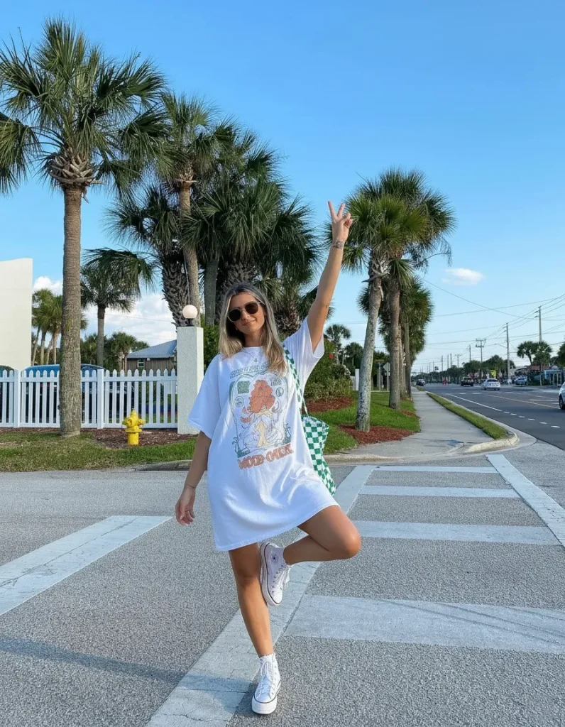 - Layering Strategy: The oversized tee works as your primary top layer. For cooler moments or sun protection, throw a denim jacket or a lightweight flannel shirt around your waist. A belt bag worn across the chest acts as another functional layer.