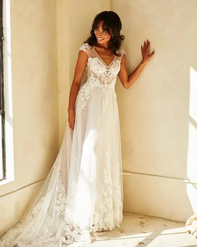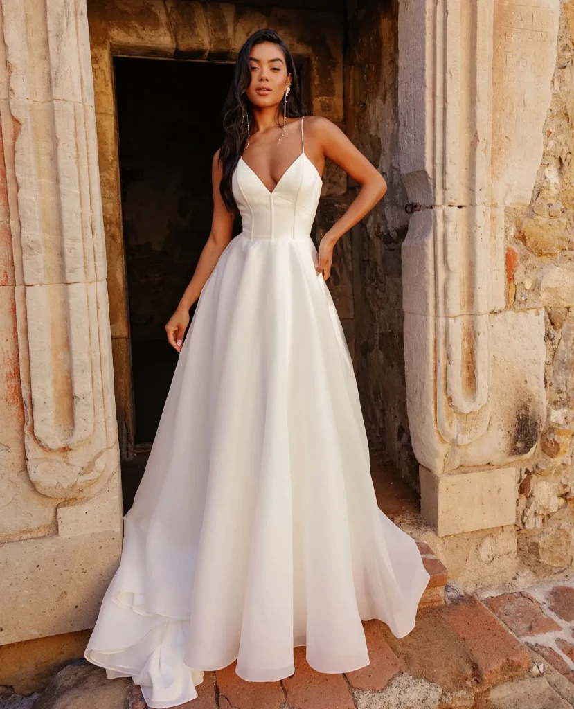 • Fabric & Texture: Works beautifully with any fabric. Chiffon or tulle A-lines feel soft and ethereal, while satin or mikado versions offer a more structured, classic romance. Lace overlays are a perfect match.
