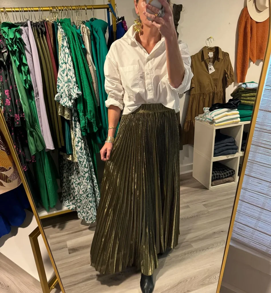 - Color Stories: A silver pleated skirt is incredibly versatile, pairing with white, black, grey, or any shade of blue.