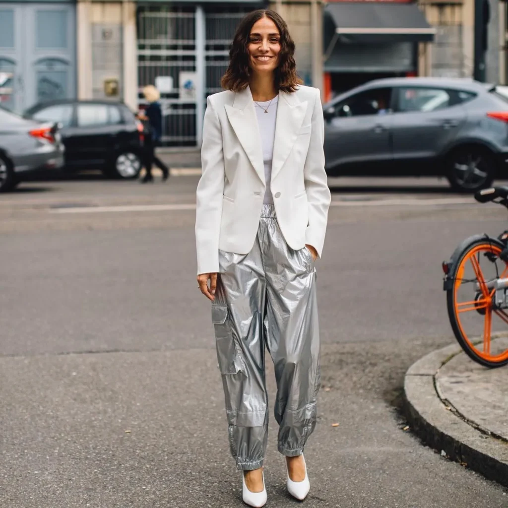 - Silhouette Management: Balance the boldness of the metallic pants with a simple, classic silhouette on top.