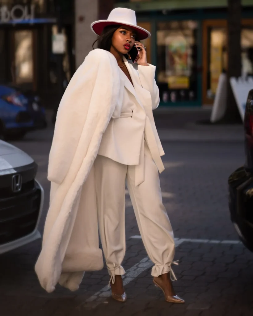 - Signature Item: A tailored Blazer and matching Trousers in cream or winter white.