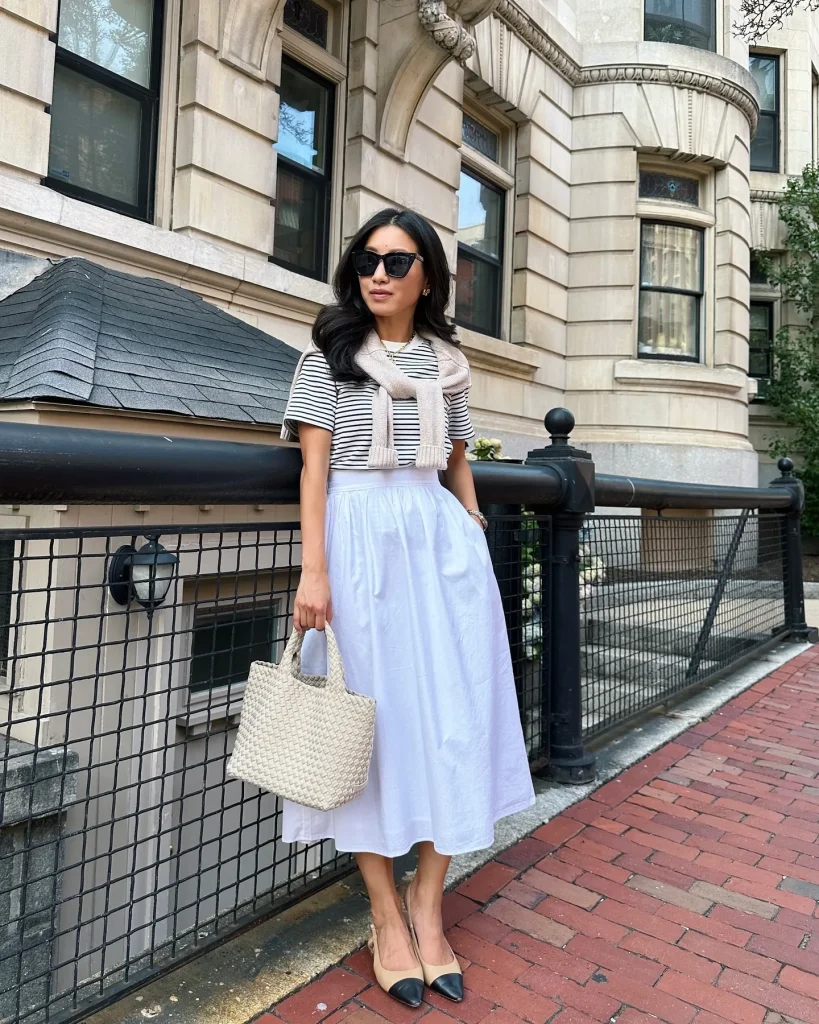 - Signature Item: An A-line skirt in cotton, linen, or a lightweight blend (midi or knee length).
