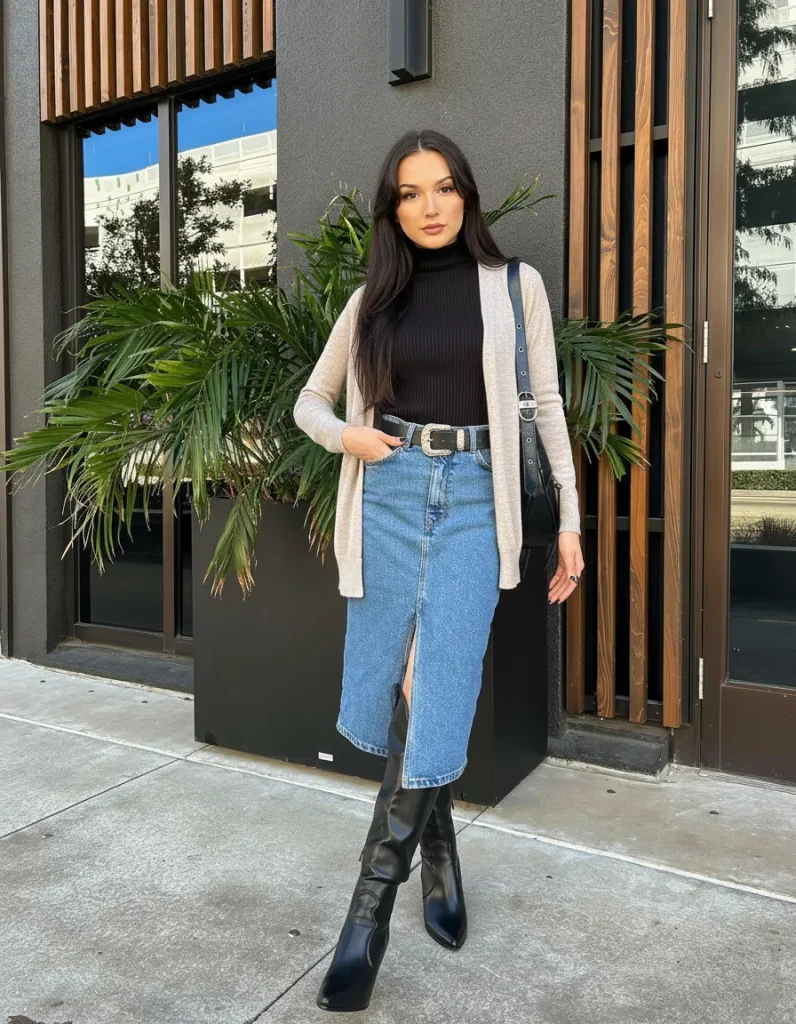 A denim midi skirt offers a trendy twist to professional attire. Pair with a lightweight cardigan for a cozy yet stylish balance