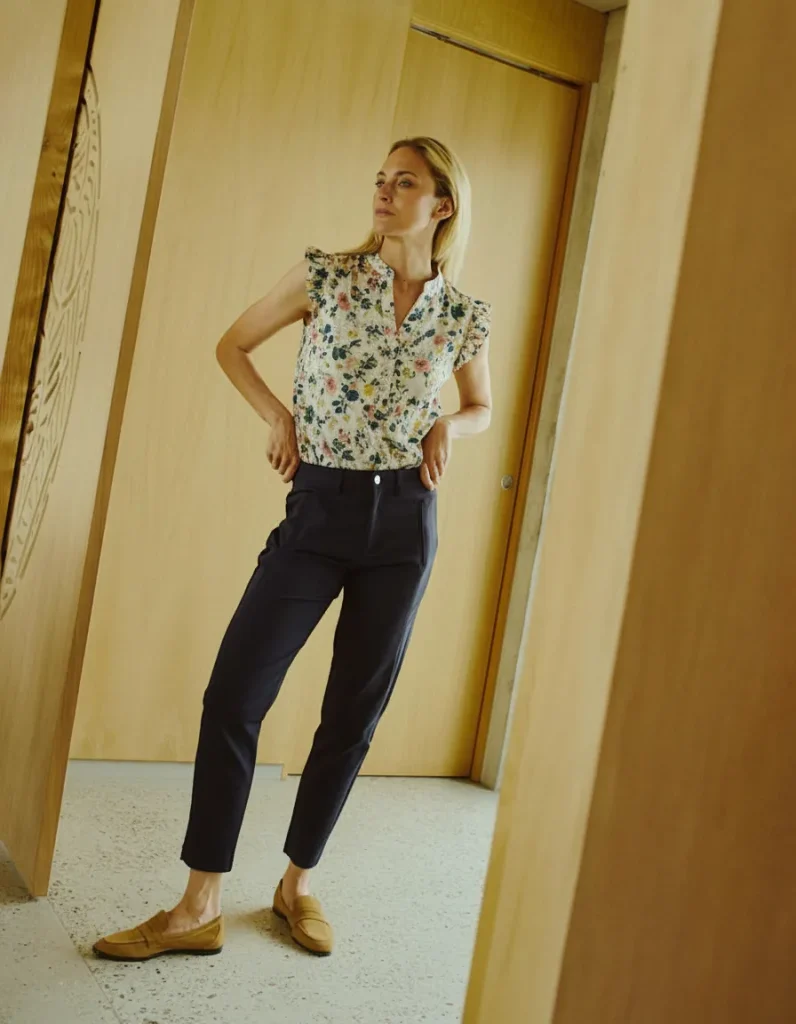 A floral blouse adds a touch of springtime charm, while tapered pants keep the look professional and structured.