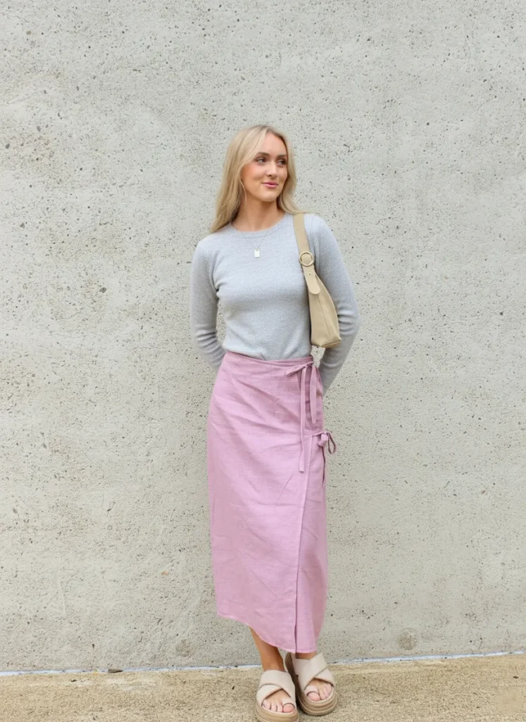 A wrap skirt offers movement and elegance. Pair with a fitted sweater for a balanced and stylish outfit.
