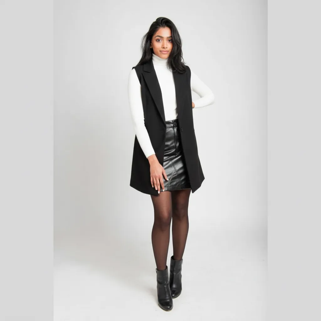 A sleeveless vest over a fitted turtleneck offers a chic, layered look that transitions well from chilly mornings to warmer afternoons.