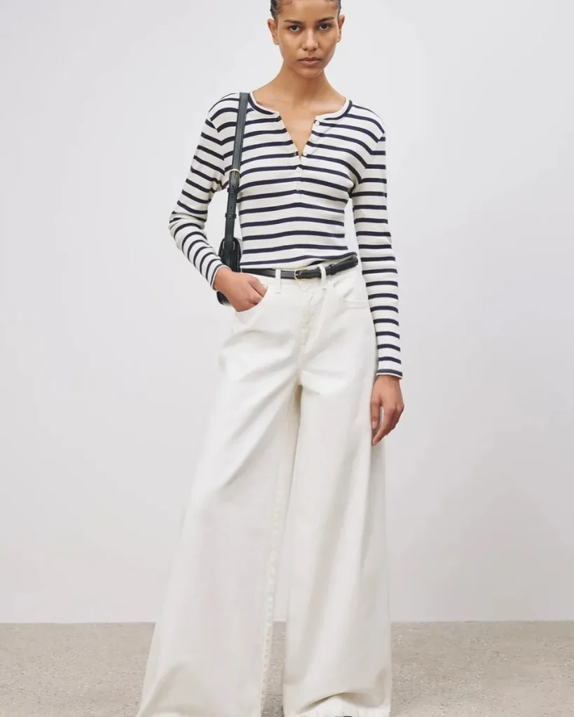 Stripes add a classic touch, while wide-leg pants keep things relaxed and stylish. Pair with pointed flats for a polished finish.