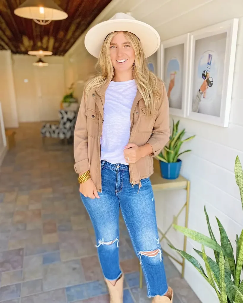 For a casual Friday look, layer a utility jacket over a simple blouse and structured jeans. Stick to darker denim for a more professional feel.