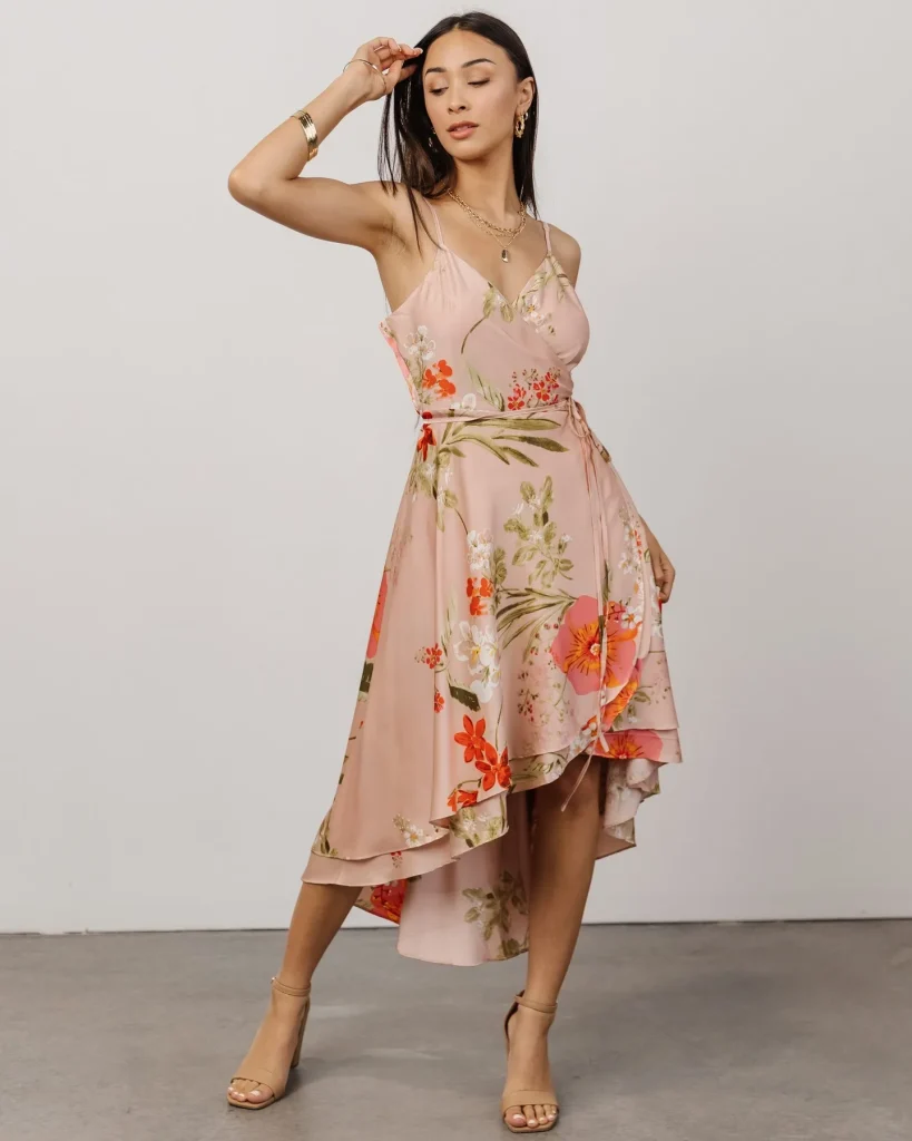 A wrap dress is universally flattering and easy to style. Add block heels and minimal jewelry for a refined yet comfortable outfit.