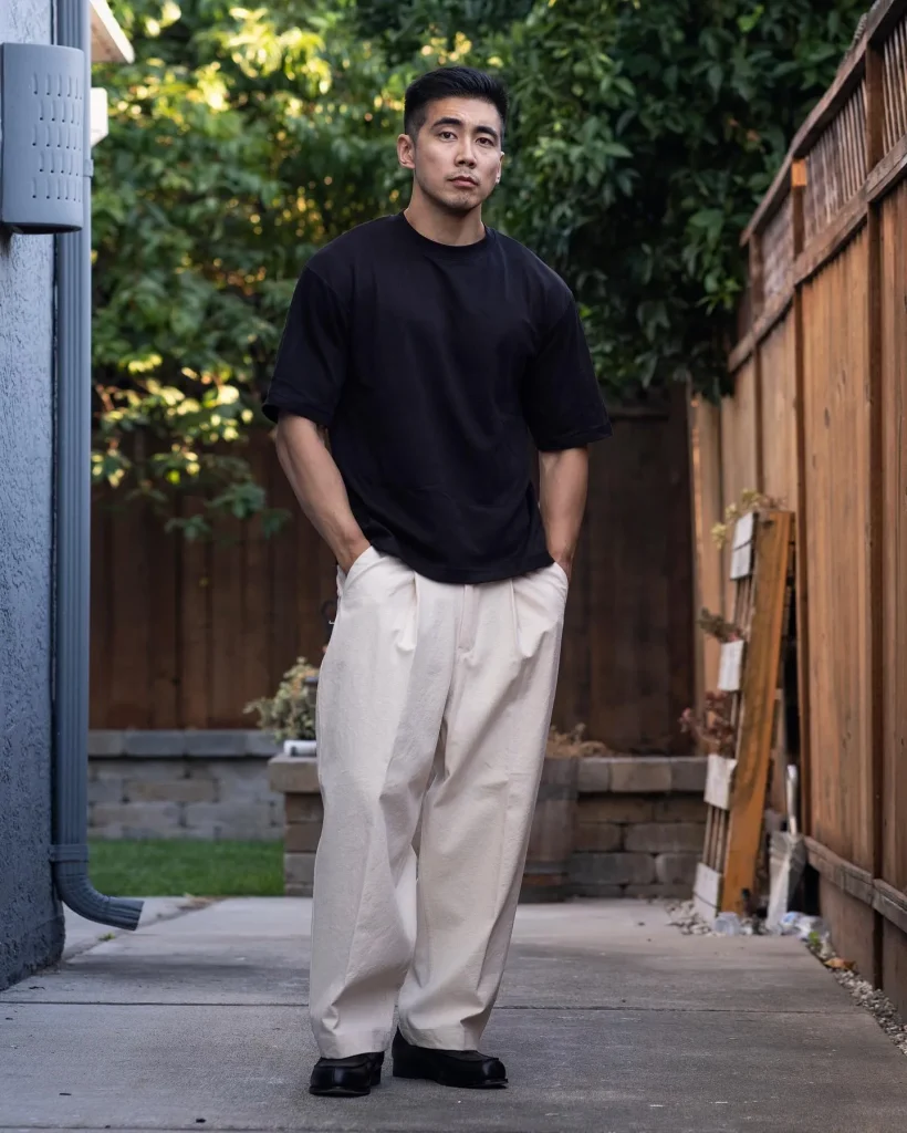 A relaxed, boxy tee tucked into wide-leg trousers is a streetwear staple. Add chunky sneakers or slides for a casual-cool finish.