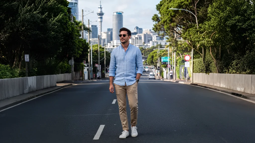 For a dressier summer look, pair a lightweight cotton blazer with a crisp white tee and slim-fit trousers. Loafers or white sneakers complete the outfit.