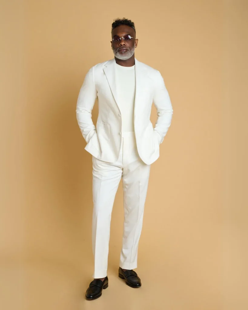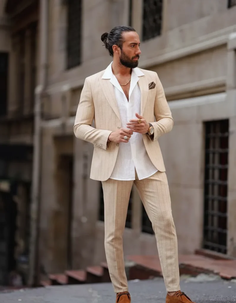 For summer weddings or fancy brunches, a linen suit in beige or light blue paired with a breezy, unbuttoned shirt is both stylish and comfortable.