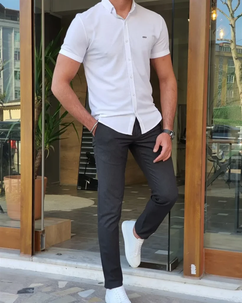 For summer nights out, go for a dark, short-sleeve button-down tucked into slim pants with sleek sneakers or loafers.